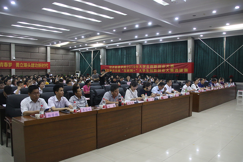 2019年大学生创新创业大赛决赛在图书馆报告厅举行。学院副院长赵宇、党委副书记张丽英、各系党总支书记、各系主任出席活动,300多位学生观摩了比赛。