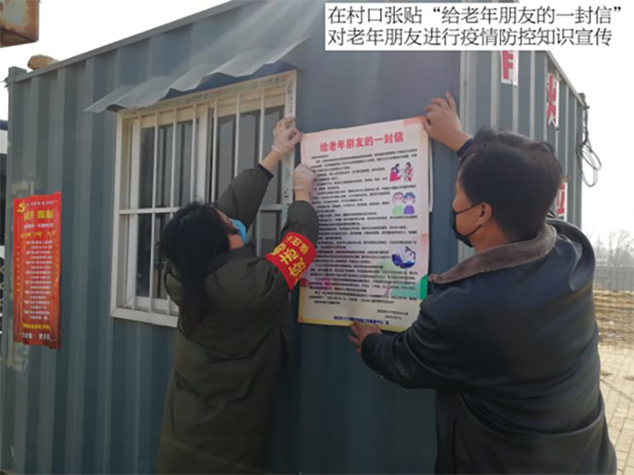 管理系2017级贾凯媛(左)在村口张贴宣传标语