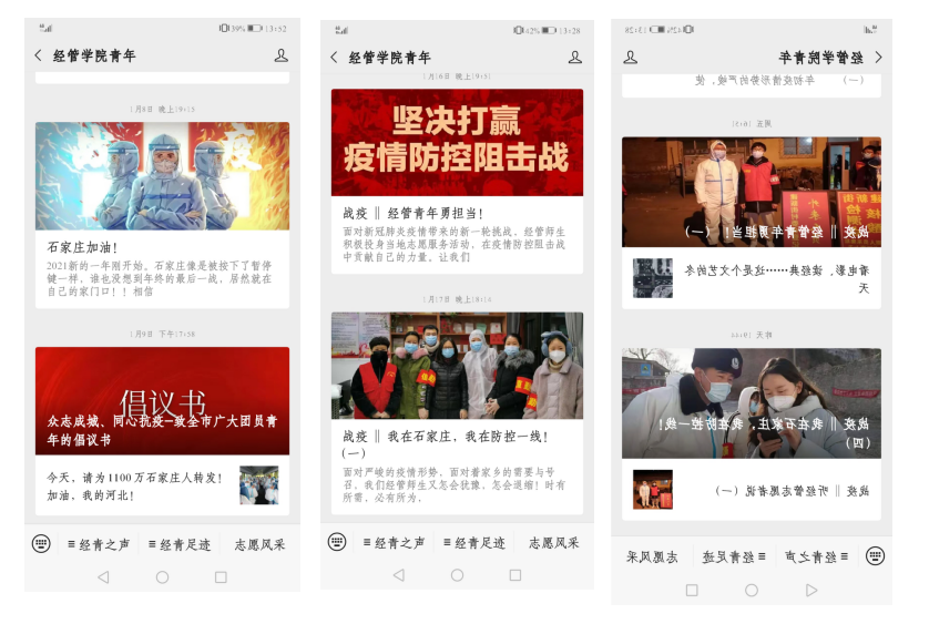 自1月5日以来,经管团员青年中涌现出了大批志愿者,在社区、街道办进行志愿服务,主要从事小区执勤、测体温、核酸检测数据录入、人员信息登记、小区消杀、搬运发放物资等服务工作。返乡的经管团员青年们积极响应当地政府部门号召,到社区(村)报到,在符合当地防控政策的前提下,做好自身防护,努力当好疫情群防群控的“战斗员”、“宣传员”、“保障员”,为当地抗疫工作贡献了力量,彰显出经管学子的良好风貌。