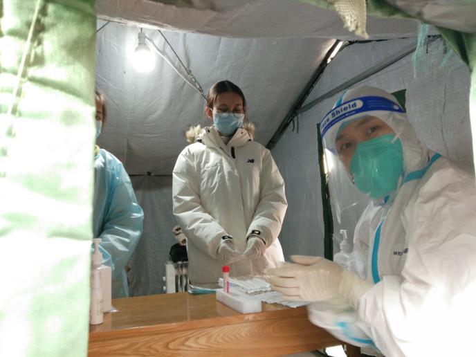 感受到学校关爱的同时,同学们也奉献出了自己的爱。1月5日居委会发布招募志愿者信息,三人毫不犹豫地报名参与,上岗后积极工作,帮助录入核酸检测的信息,维护现场秩序。