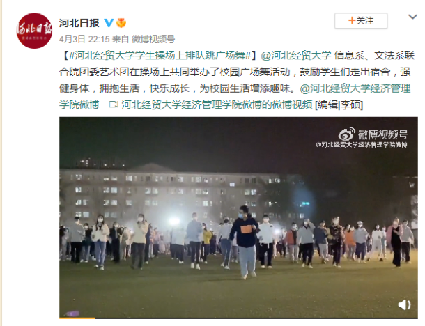 学生举办周末校园广场舞活动的视频,展现大学生激情四射的青春活力。此外,河北日报微博、石家庄校园微博也对此活动进行了报道。