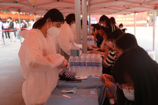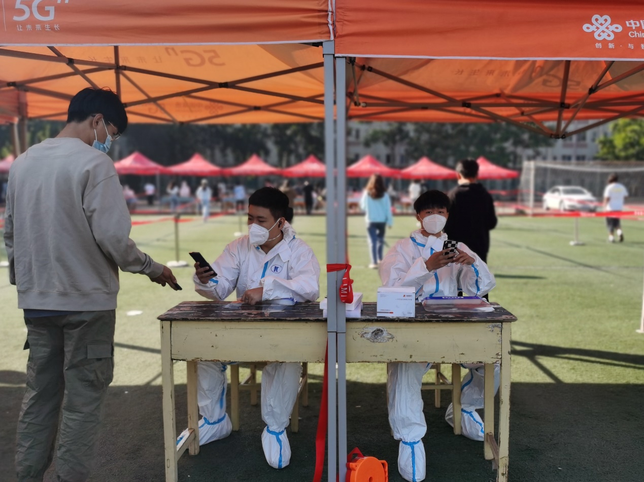 从开学到现在,核酸检测几乎每隔一天做一次,日常校园守护更是天天值守。每日早上天刚蒙蒙亮,志愿者们就早早来到操场上,身着防护服,佩戴口罩,坚守在分配好的核酸检测通道旁,进行扫码工作。这项工作看着简单,可一站就是三四个小时,还要维持学生队伍秩序,督促同学们保持一米间隔距离,助力医生做好核酸检测工作。