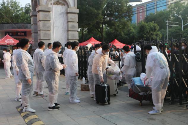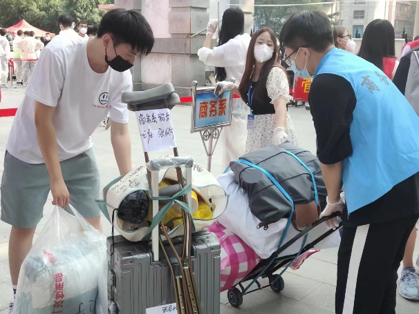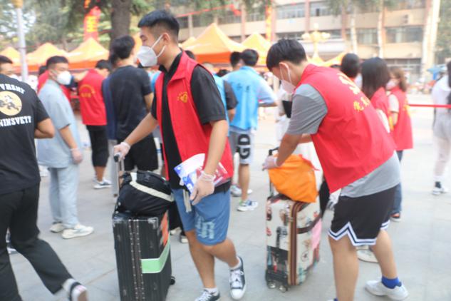 车站迎新工作的重点是把学生们安全送达,在校园迎新的志愿者们主要任务就是运送行李了。“要把接送行李秩序维持好,也是比较有挑战的事。”青协另一位负责人王子昆同学表示,“我们的人手不太够,有时候会出现新生来的集中,没有办法快速对行李进行消杀和转运。”新生报到那天中午一辆辆送子求学的私家车停在东门,大件小件的行李搬运下车,志愿者们既要完成对每件行李的消杀,还要记清楚哪件行李是哪个系的学生的,将其转运至校园内后,联系各系志愿者来准确接收,面对这么杂乱的现象,“我们的志愿者解决的办法只有一个,就是每个人付出200%的努力去完成。”新生报到那天天气比较热,志愿者们身上的防护服也不透气,来回拿行李,累得大汗淋漓,里面的衣服一把都能拧出水来。“但大家热情高涨,临危不乱,不辞辛苦,各司其职,圆满地完成最繁重的工作。他们是勇挑重担的‘摆渡人’。”院学生会主席史兴业这样评价自己的团队成员。