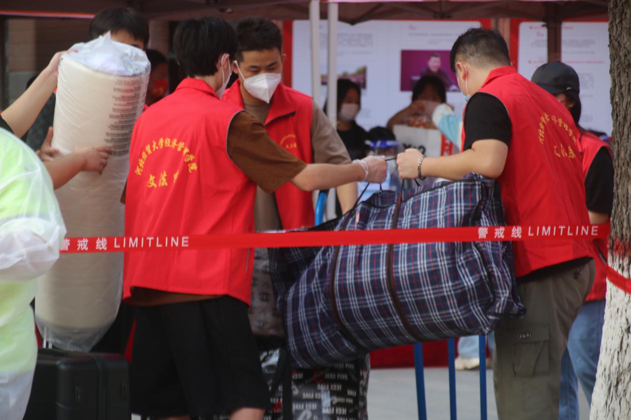 接力院学生会志愿者完成行李运送任务的是各系志愿者。依然是早上6点半,各就各位,他们分工明确,一小部分人引导学生做抗原、核酸、完成报到手续;一大部分人手拿肩扛,大包小包,不厌其烦地来往于各系站点和宿舍之间。