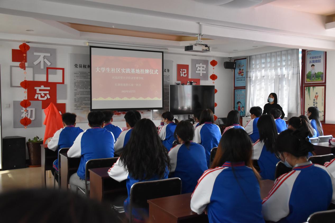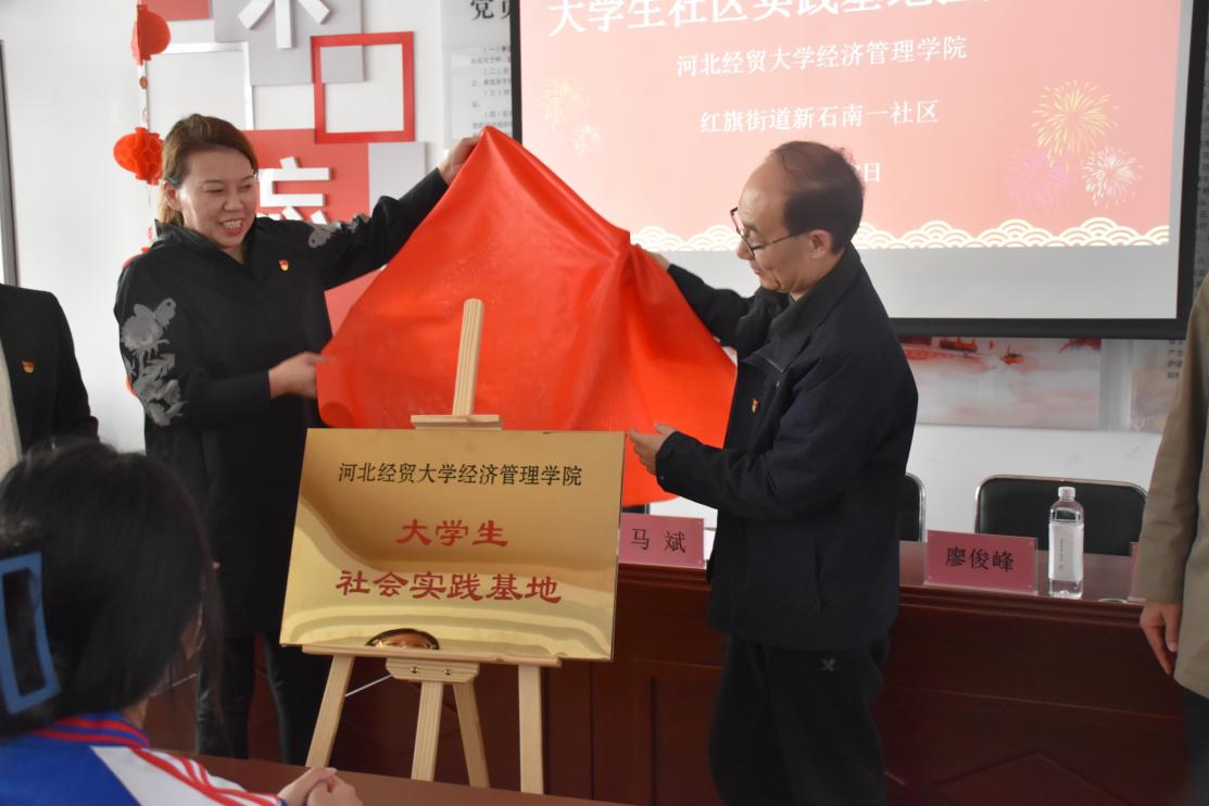 与石家庄市桥西区红旗街道举行大学生社会实践基地揭牌仪式。石家庄桥西区红旗街道党工委书记冯晓芬,学院党委书记马斌,会计系党委书记廖俊峰,会计系党委副书记张艳敏,参加了揭牌仪式,活动由新石南一社区党委书记赵媛主持。