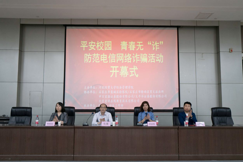 学院领导马斌、张进良、江秀军,石家庄市栾城区检察院党组副书记、副检察长裴丽艳,石家庄市桥西区育文派出所民警武亚涛,申万宏源证券有限公司石家庄中山西路证券营业部总经理韩晓旭,太平洋证券股份有限公司河北分公司负责人刘英磊,北京麦课在线教育技术有限公司区域经理杨晓光,经济系党委书记蔡杨及学生代表200余人参加启动仪式。