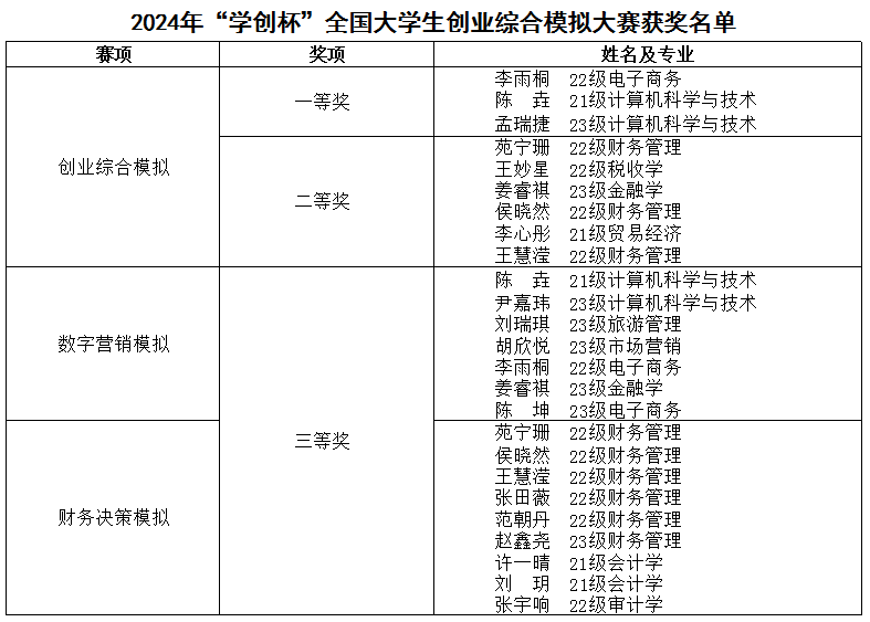 选派了3支创业综合模拟赛项队伍、3支数字营销模拟赛项队伍和3支财务决策模拟赛项队伍组成的团队,在实践教学部老师的带领下参加了此次比赛。经过两天紧张激烈的线上模拟,创业综合模拟赛项取得一等奖1项,二等奖2项;数字营销模拟赛项取得三等奖3项;财务决策模拟赛项取得三等奖3项。