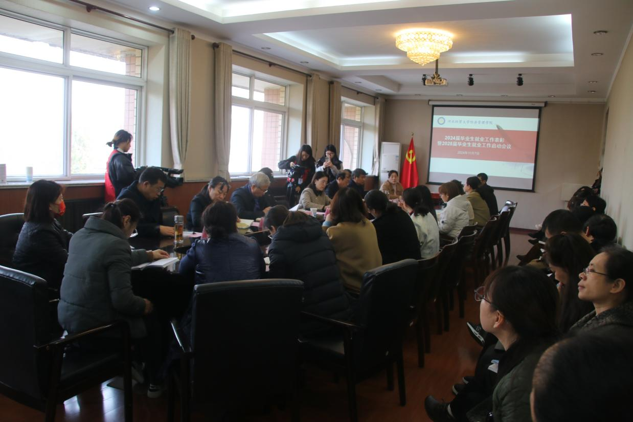 2024届毕业生就业工作表彰暨2025届毕业生就业工作启动会议在行政楼五楼会议室举行。学院党委书记蔡杨出席会议并讲话,各系书记、主任、副书记、负责就业的老师、全体专兼职辅导员参加。会议由副院长王鸿喜主持。
