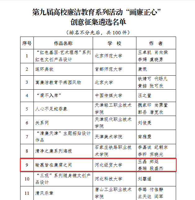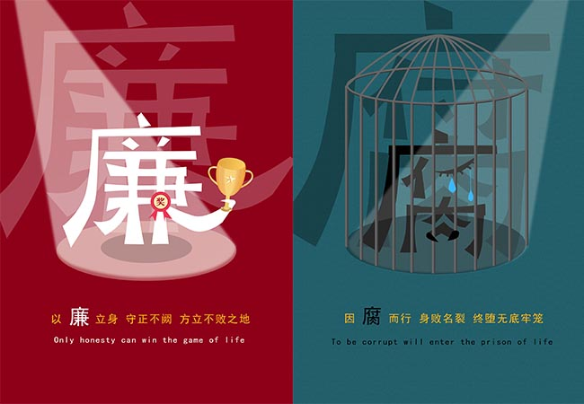 《输赢皆在廉腐之间》由文法系2022级新闻2班王晶设计,党委宣传部郑廷、大学宣传部姜瑞、段盛杰指导,该设计作品运用对比和拟人的手法,将“廉”与“腐”二字刻画成“获奖者”和“入狱者”的形象,反腐倡廉的主题跃然纸上,作品旨在倡导崇廉拒腐的社会风气,传递出积极向上的价值观。高校廉洁教育系列活动知识问答全国仅有100名学生上榜,美高梅网上赌博(中国)唯一官方网站
