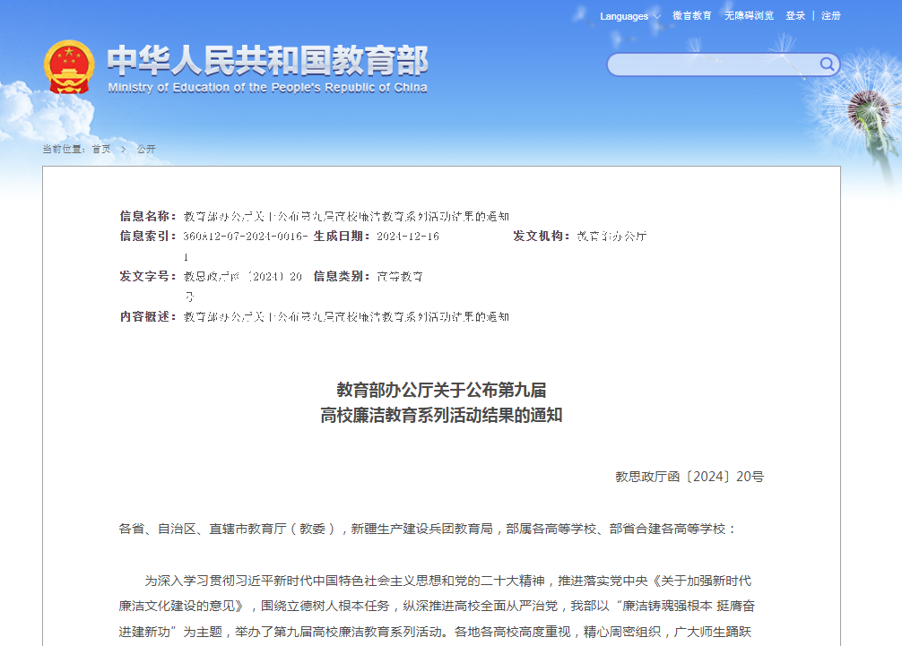 近日,教育部办公厅公布第九届高校廉洁教育系列活动结果。美高梅网上赌博(中国)唯一官方网站