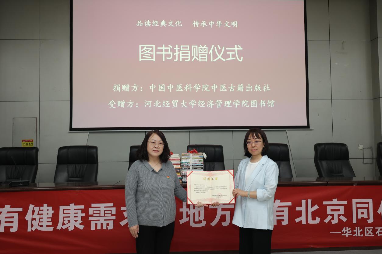 图书馆捐赠了47 部中医药文化科普读物。副院长董芝代表学院接受了捐赠,并向出版社颁发了捐赠证书。这些图书丰富了学院的藏书资源,为师生了解中医药文化知识提供了宝贵资料。