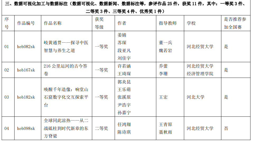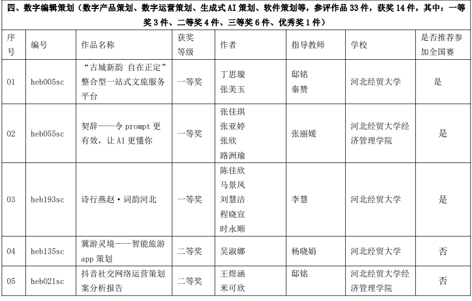 全国大学生数字编辑创新大赛由中国编辑学会主办,旨在展示我国大学生在视听新媒体、数据多媒体、数据可视化加工与数据标注和数字编辑策划等方面成果,促进数字、文化与科技的融合创新及成果转化应用,已然成为我国重要的创新成果展示、交流、转化及创新人才甄选的平台。经专家评审,由乔蕾、李珊老师指导,许若涵、王琦琛同学制作的《216公里运河的古今答卷》荣获数据可视化加工与数据标注一等奖并推荐参加国赛;由张丽媛老师指导,张佳琪、张亚婷、张欣、路洲瑜等同学制作的《契辞——令prompt更有效,让AI更懂你》荣获数字编辑策划一等奖并推荐参加国赛。此外,《抖音社交网络运营策划案分析报告》荣获数字编辑策划二等奖,《用杂技讲好中国故事》和《梨膏记:赵县古法的温度》荣获视听新媒体三等奖,《跟着赵云游正定》荣获数据多媒体三等奖。