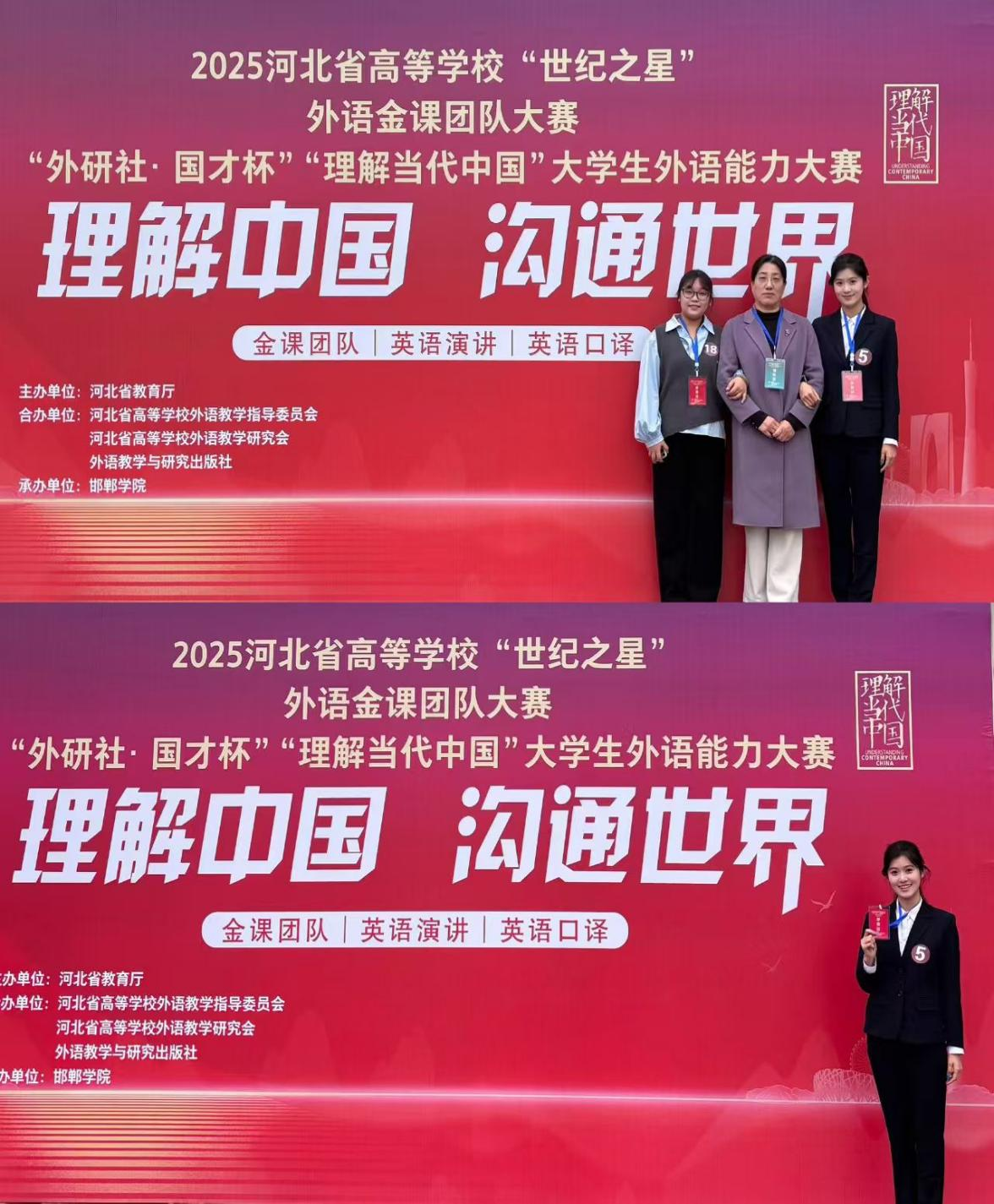 文法系精心组织,周密安排,携手河北经贸大学外国语学院组建专业指导团队对参赛选手进行专业培训,精心打磨,反复演练,帮助选手们围绕大赛主题,通过演讲、写作、翻译、短视频等形式,展示中国在经济、政治、文化、社会、生态文明等领域发展的生动案例。最终,在演讲赛项中,俞文晴、赵一帆同学获银奖,郭如恒同学获铜奖;在短视频赛项中,要旭科、于辰、张怡然同学的作品《盐碱地里的辰光,新农人手中的希望》获银奖,祝艺航、葛雅涵同学的作品《映时代之美,守万家之责》和许若涵、王琦琛、赵一帆同学的作品《沧州大运河:千年文脉与生态新章的交响》获铜奖;在综合赛项中,于宸鸥、康梓璐、王欣语同学获铜奖;在笔译赛项中,屈星辰、陈瑜同学获铜奖。