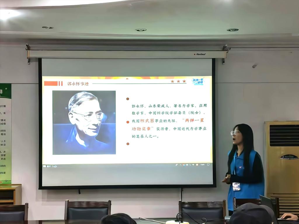 宣讲现场,同学们以历史为卷、人物为笔,铺展那段为国铸盾的激情岁月。钱三强弃海外锦绣毅然归国拓荒,郭永怀用生命守护珍贵科研数据,金银滩草原上科研工作者们克服万难坚守初心……这些鲜活的故事,让“热爱祖国、无私奉献,自力更生、艰苦奋斗”的“两弹一星”精神内核熠熠生辉。配合珍贵的影像与资料,那段从“开业之石”到“东方巨响”的辉煌征程,深深震撼了在场每一位听众。