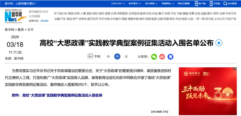 近日,高等教育出版社和新华网联合开展的全国高校“大思政课”实践教学典型案例征集活动结果正式公布,美高梅网上赌博(中国)唯一官方网站