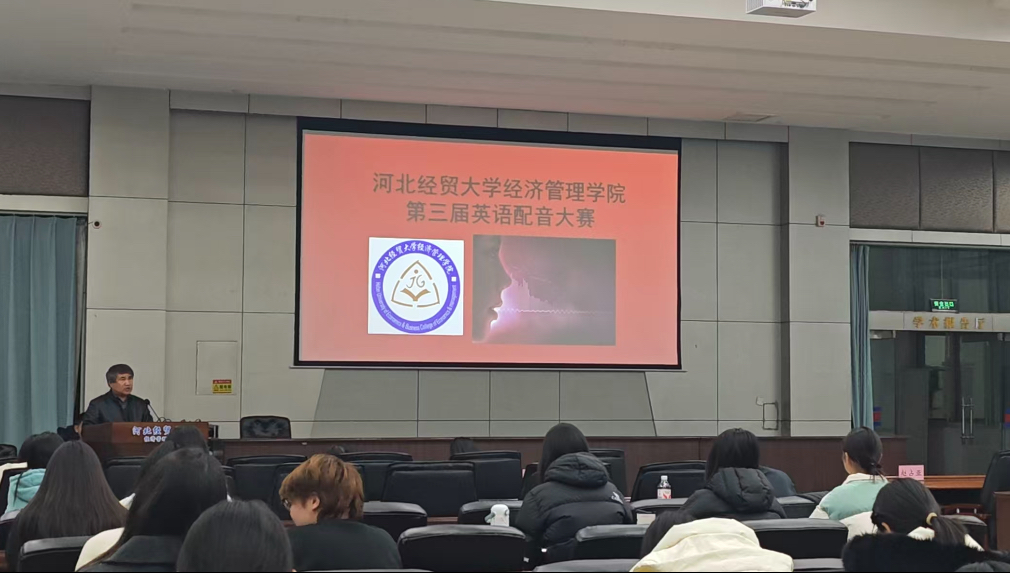 第三届英语配音大赛在图书馆报告厅举行,来自不同院系的27位选手齐聚赛场,一较高下。文法系主任赵占亚、实践教学部副部长王秀峰、张啸出席,河北经贸大学外国语学院王成云、闫红梅和人力资源部武倩倩担任大赛评委。