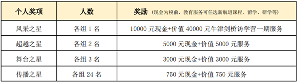 全国阶段/中外青少年展演奖项:所有参与的选手将被授予“中国故事精彩讲述者”称号,并用个人奖项做差异区分排名第1、排名第2-3、排名第4-6以及排名第7-30名的选手。