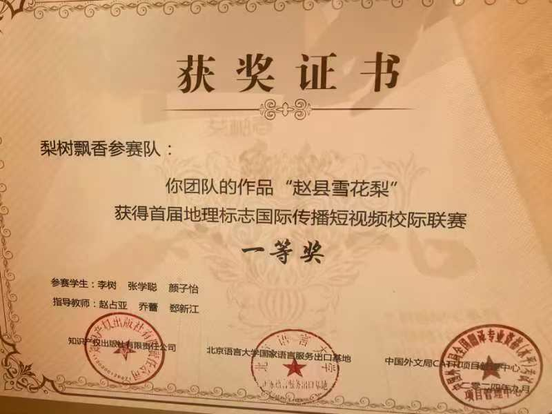 大赛历时三个月,文法系赵占亚主任和乔蕾老师带领制作团队在学院领导的大力支持和全院师生的积极配合下,赴河北赵县古梨园、藁城宫面厂和福建武夷星茶叶公司现场拍摄,创新角度,不辞辛苦;在后期剪辑制作过程中反复打磨,精益求精;在抖音平台投票环节上下联动,竭尽全力。最终,功夫不负有心人,学院推送的3部短视频作品《赵县雪花梨》、《武夷山岩茶》和《面面俱到---藁城宫面》在386部作品中脱颖而出,分获国赛一等奖和二等奖。