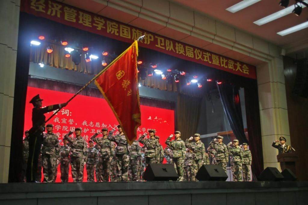 换届环节庄严有序。22级队干为23级队员卸下臂章,象征着责任与荣誉的传递;新老队员代表郑重交接国旗、指挥刀与礼宾枪,完成使命的接力。学院领导为退任队干颁发荣誉证书,并为第十七届队干颁发聘书。