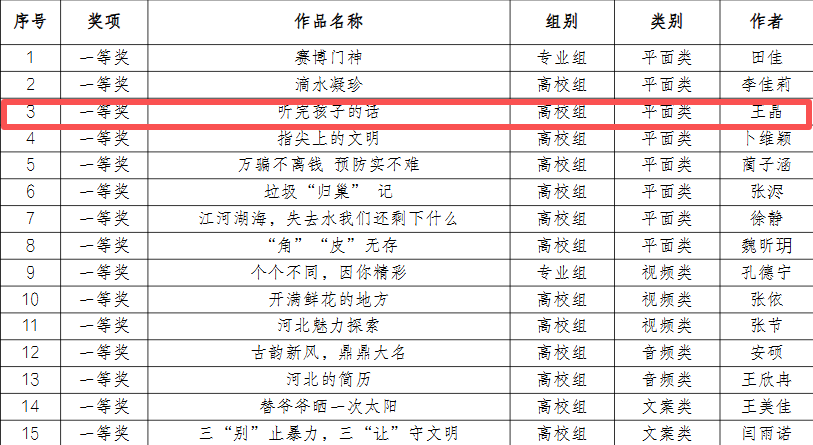 本届大赛以“奋进河北我创益”为主题,面向全社会广泛征集兼具专业性、思想性、文化性和艺术性的优秀公益广告作品,聚焦“爱党爱国,强国有我”“美丽河北,双争有我”“高质量发展,建功有我”“珍惜水资源,节水有我”等四大方向,设置平面类、文案类、视频类、音频类、互动类等五大类别。大赛鼓励使用多种形式进行公益创意表达,坚持守正创新,紧扣时代脉搏,为精神文明建设持续注入活力。文法系王晶同学凭借扎实的艺术功底、深厚的专业素养、卓越的创意才能一人斩获18个奖项。王晶同学的作品主题多元,种类丰富,形式各异。《听完孩子的话》以独特的切入角度、新颖的展现手法、细腻的情感表达荣获平面类一等奖,它采用“父母视力表”的创意形式,将儿童心理健康诉求转化为“心理视力表”的视觉语言,检测亲子间对心理信号的感知度,呼吁家长关注儿童心理“视力”,感知孩子情绪需求。《剪纸绘农勤,惜栗承美德》等4部作品荣获平面类三等奖,《餐桌上的污染》等7部作品和《万物生,华夏兴》等6部作品分别荣获平面类和文案类优秀奖。