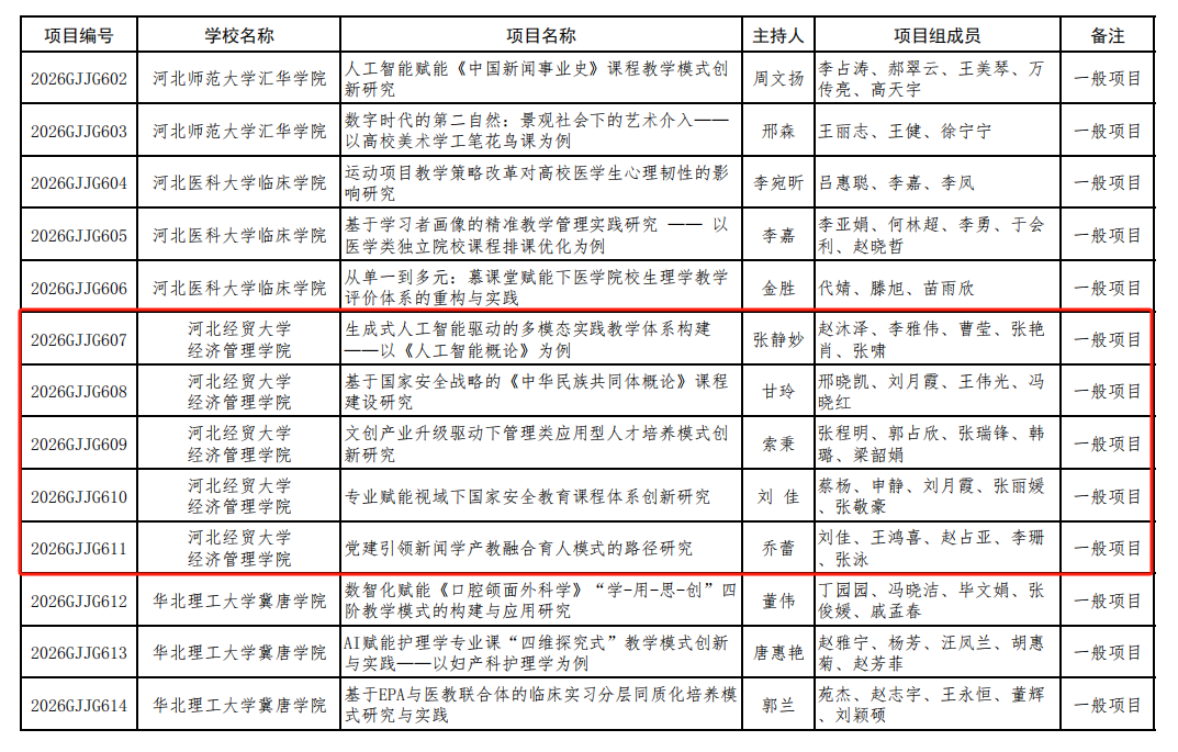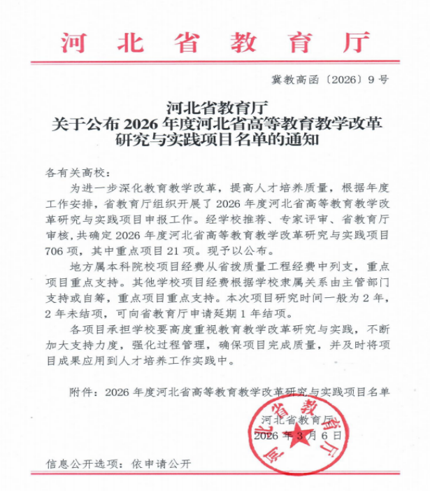 日前,省教育厅关于公布《2026年度河北省高等教育教学改革研究与实践项目名单的通知》,美高梅网上赌博(中国)唯一官方网站 申报的五项课题均获批立项。